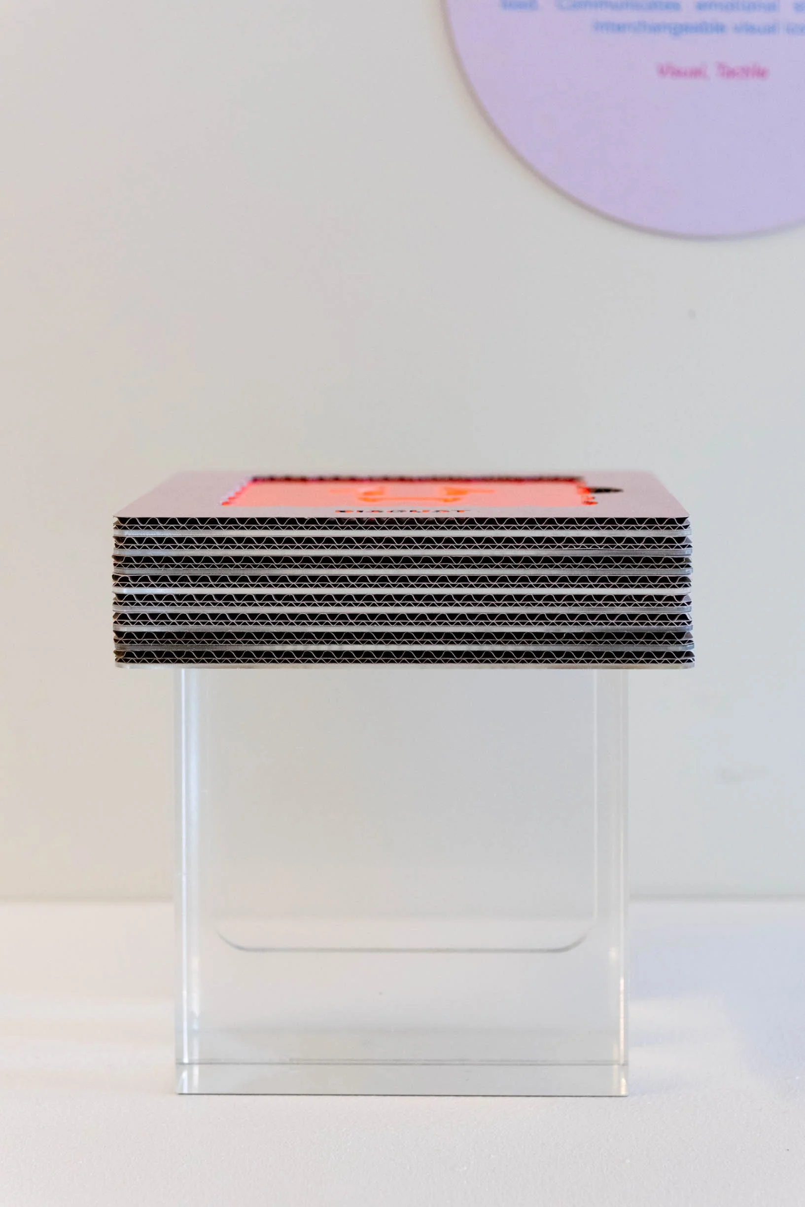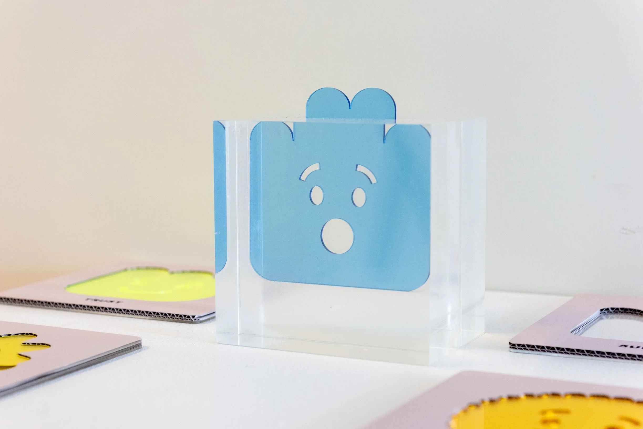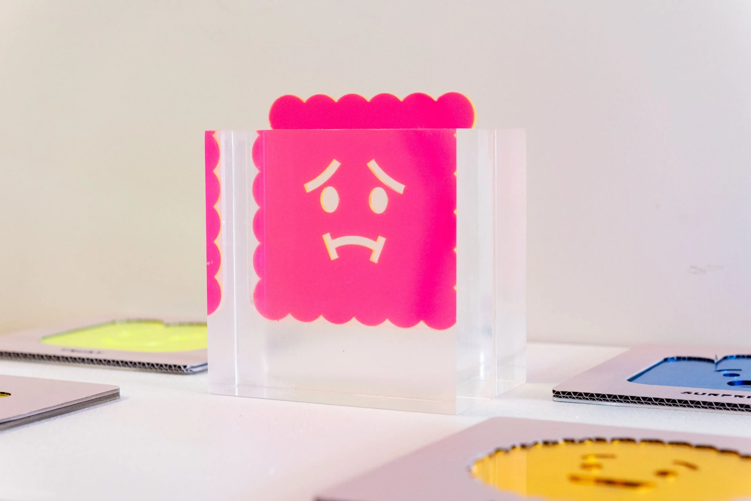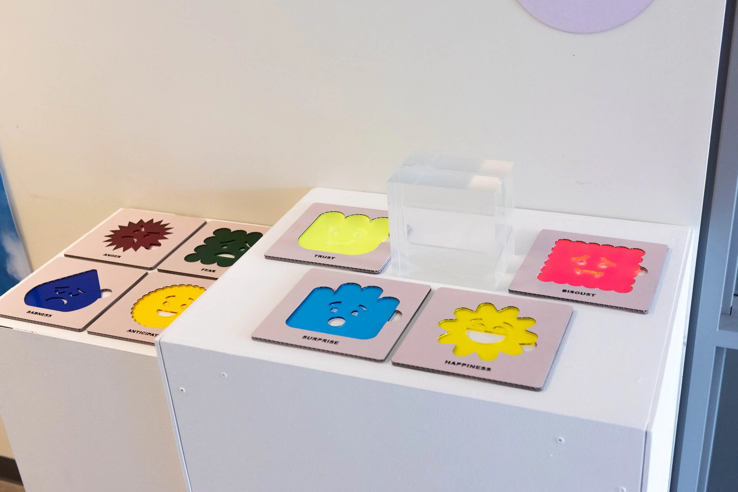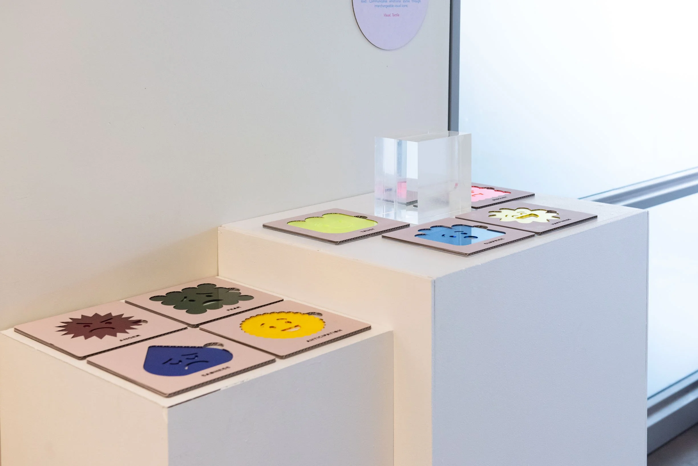 An acrylic block holder for 8 interchangeable emotion indicators, allowing the user to signal how they are currently feeling. Supports non-verbal expression, reducing verbal and cognitive load. Communicates emotional states through interchangeable visual icons. Based on Robert Plutchik’s Wheel of Emotions, this object reflects eight core feelings: happiness, trust, fear, surprise, sadness, disgust, anger, and anticipation.