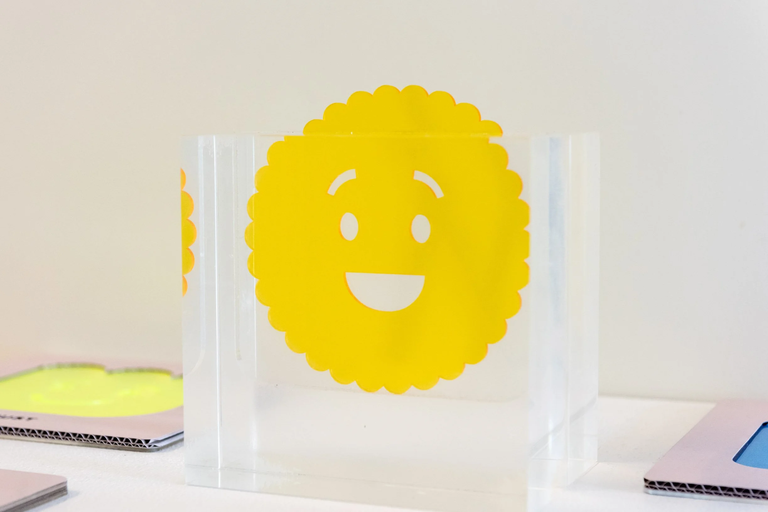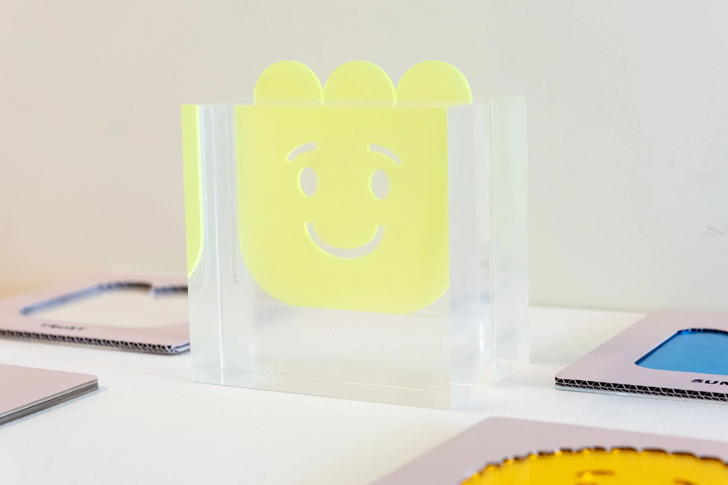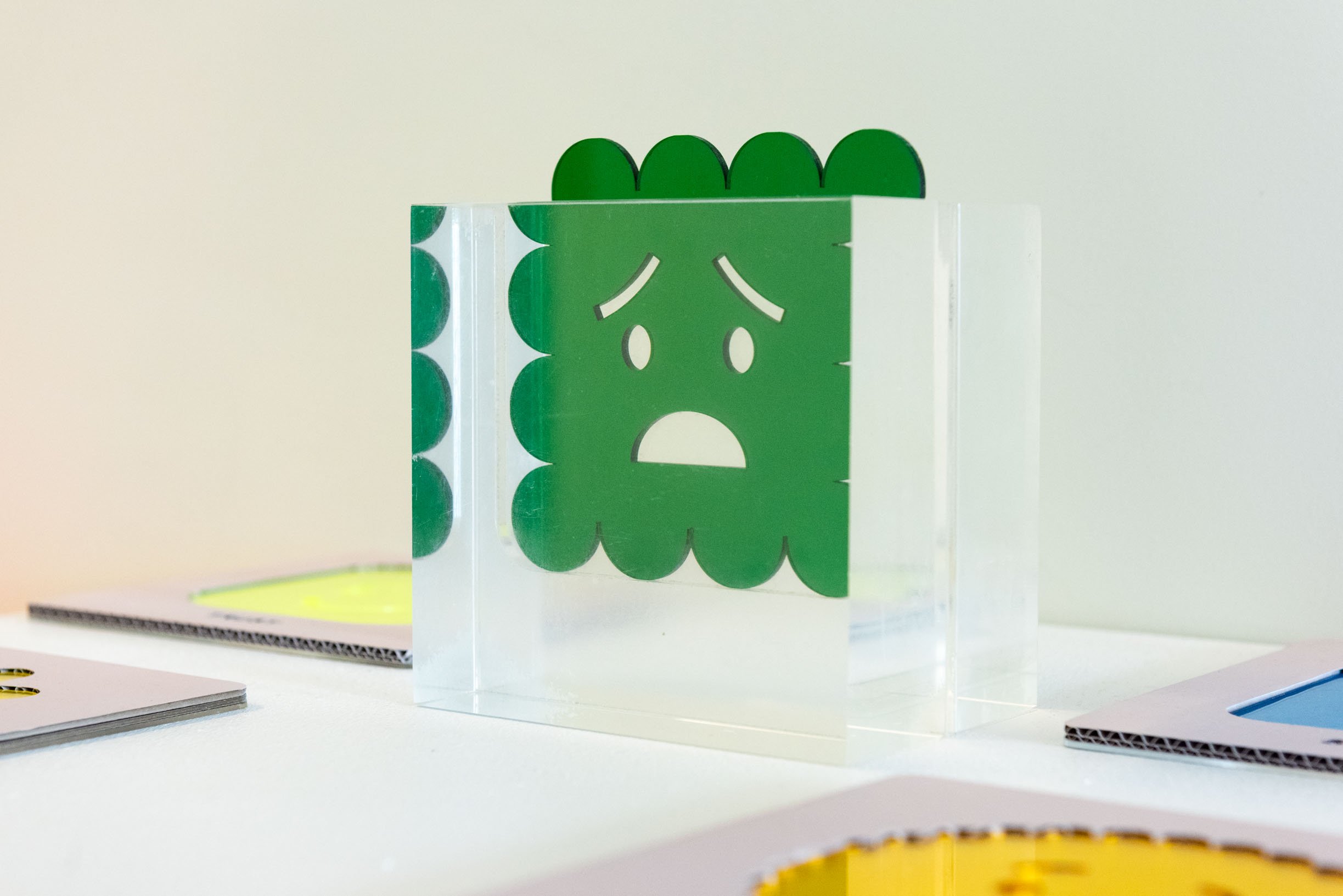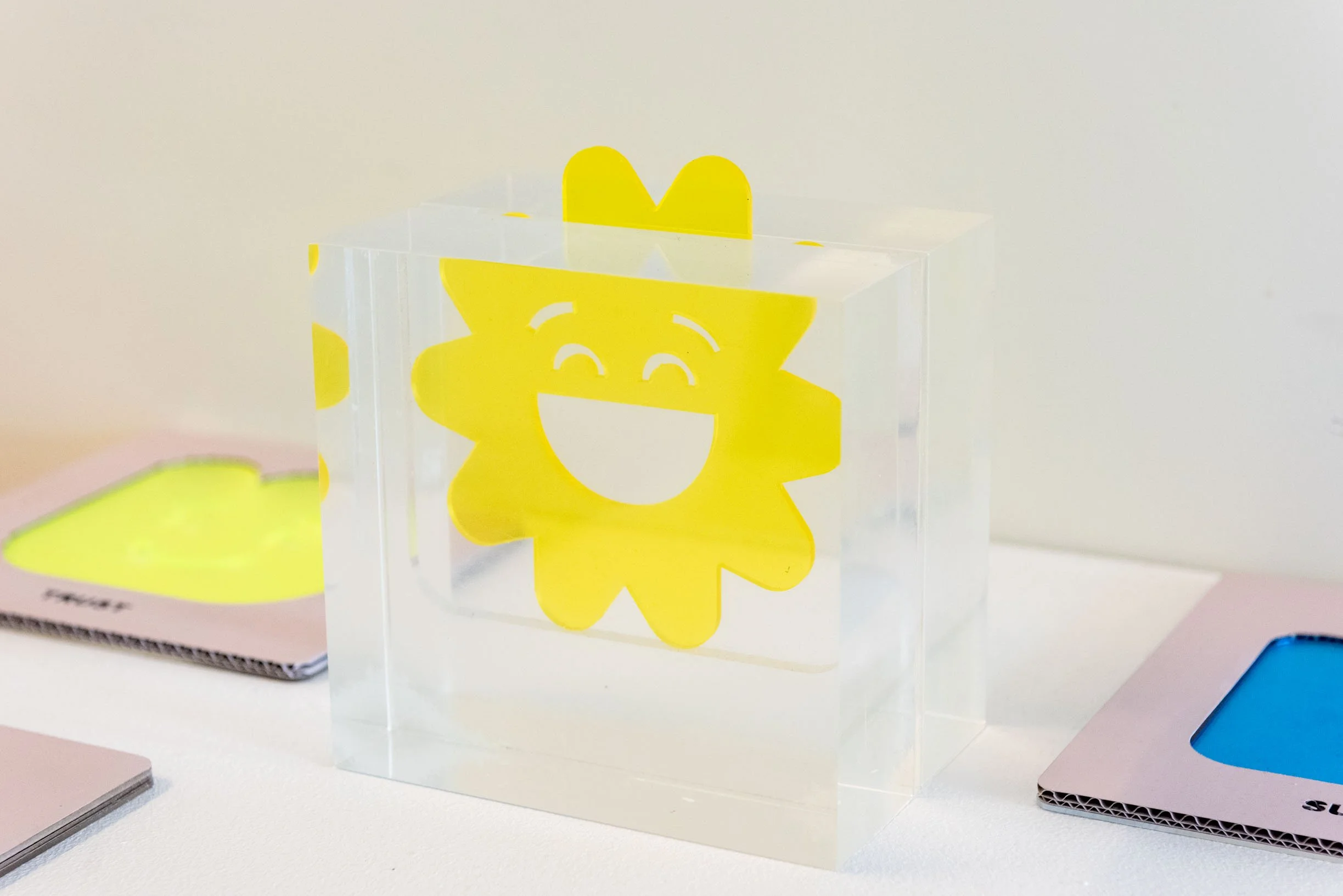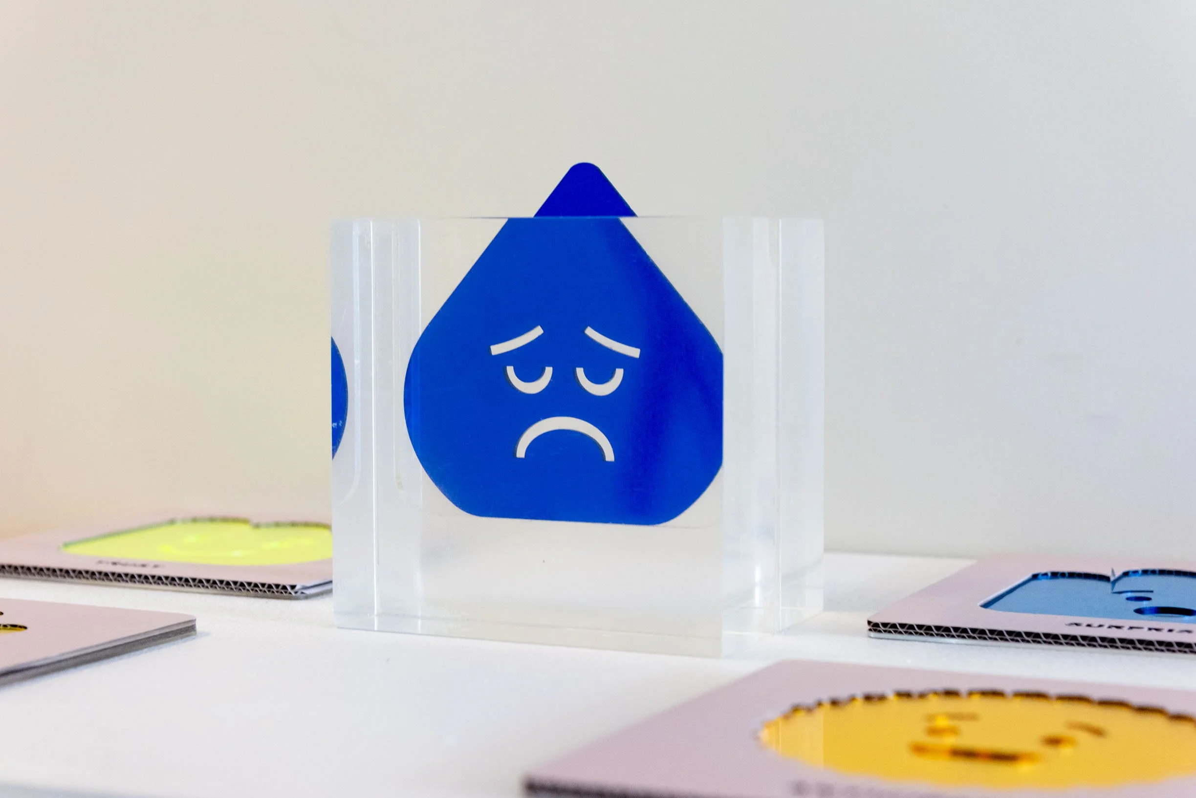 An acrylic block holder for 8 interchangeable emotion indicators, allowing the user to signal how they are currently feeling. Supports non-verbal expression, reducing verbal and cognitive load. Communicates emotional states through interchangeable visual icons. Based on Robert Plutchik’s Wheel of Emotions, this object reflects eight core feelings: happiness, trust, fear, surprise, sadness, disgust, anger, and anticipation.
